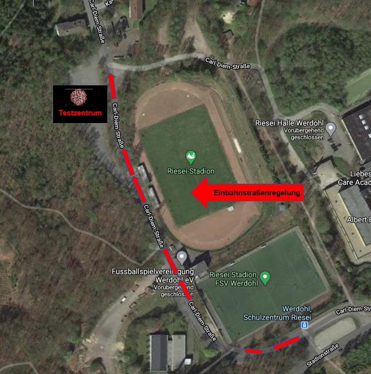 Am Freitag, 26.03.2021 hat das Testzentrum auf dem Parkplatz an der Carl-Diem-Str. (unterhalb des Stadion Riesei) in Werdohl den Dienst aufgenommen.